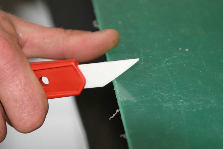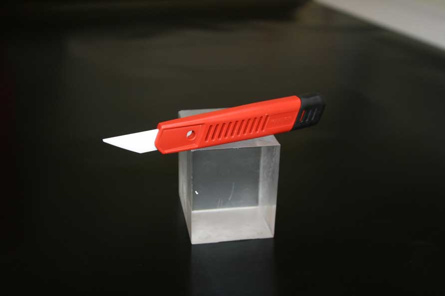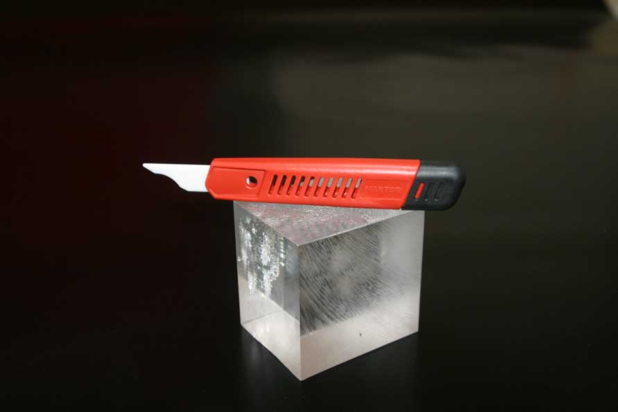 egenskaper: -Keramik är alltid hårdare än metall. -jämfört med utbytbara blad av metall eller plåt behåller keramikblad sin skärpa längre. -Knivens egg är inte helt raklinjig, utan bladets konkava egg förhindrar att kniven slinter vid avgradning av kompositmaterial och mjuka metaller. |